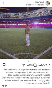 وكتب ميسي عبر “إنستجرام”: “عدتُ الليلة الماضية إلى مكانٍ أفتقده من كل قلبي، مكان كنت فيه في غاية السعادة، حيث جعلتموني أشعر بألف مرة أنني أسعد إنسان في العالم”.