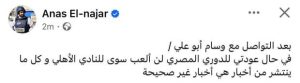 وكتب أنس النجار عبر حسابه على موقع فيسبوك: « بعد التواصل مع وسام أبو علي، أكد لي، أنه في حال عودتي لـ الدوري المصري لن ألعب سوي في النادي الأهلي، وكل ما ينتشر من أخبار خلال الساعات الأخيرة غير صحيحة بصورة نهائية».
